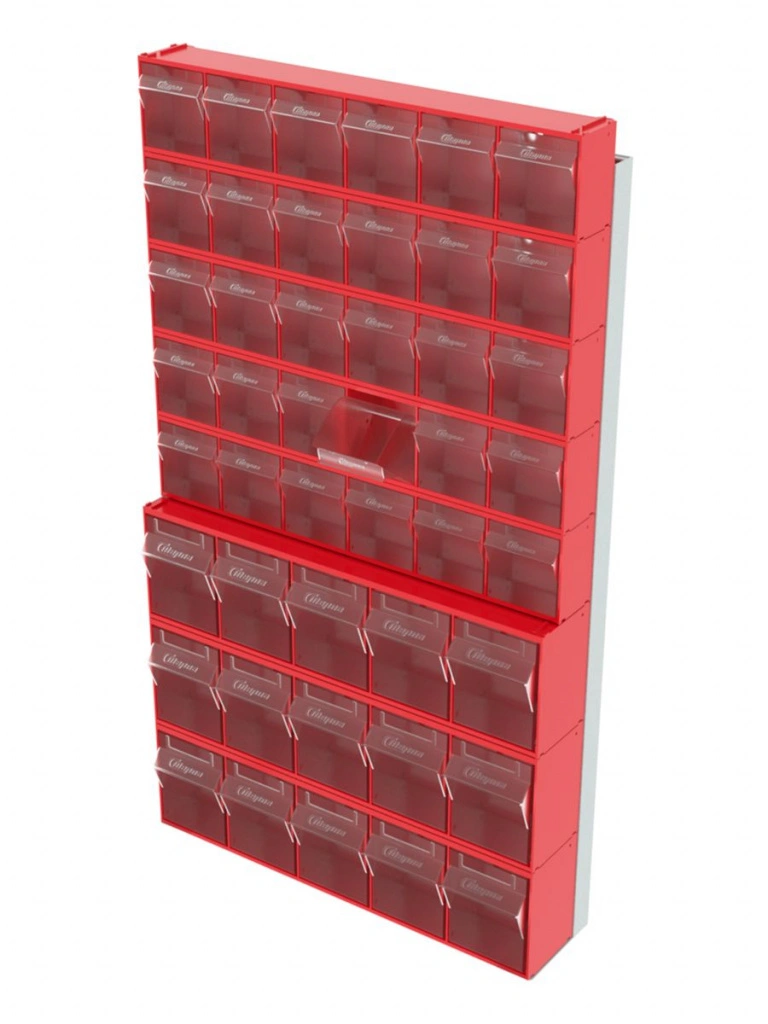 Стойка настенная Стелла-техник 402-00-05-03 (610х40х1000) представляет собой удобную систему хранения на основе откидных коробов, которая подойдет для использования в выставочных залах, магазинах, складах. Стойка крепится на стену при помощи саморезов или анкерных болтов (крепеж не входит в комплект и подбирается под уровень загруженности стойки). Комплектация: Рама FOX (610х40х1000) V402 - 1 шт.; Короб откидной Стелла-техник F-600-6 , 600х96х112мм, 6 ячеек, красный, прозрачный – 5 шт.; Короб откидной Стелла-техник F-600-5 , 600х140х168мм, 5 ячеек, красный, прозрачный – 3 шт.; Упаковка. Преимущества: Металлическое основание; Значительная устойчивость; Хорошая вместимость; Длительный срок службы.