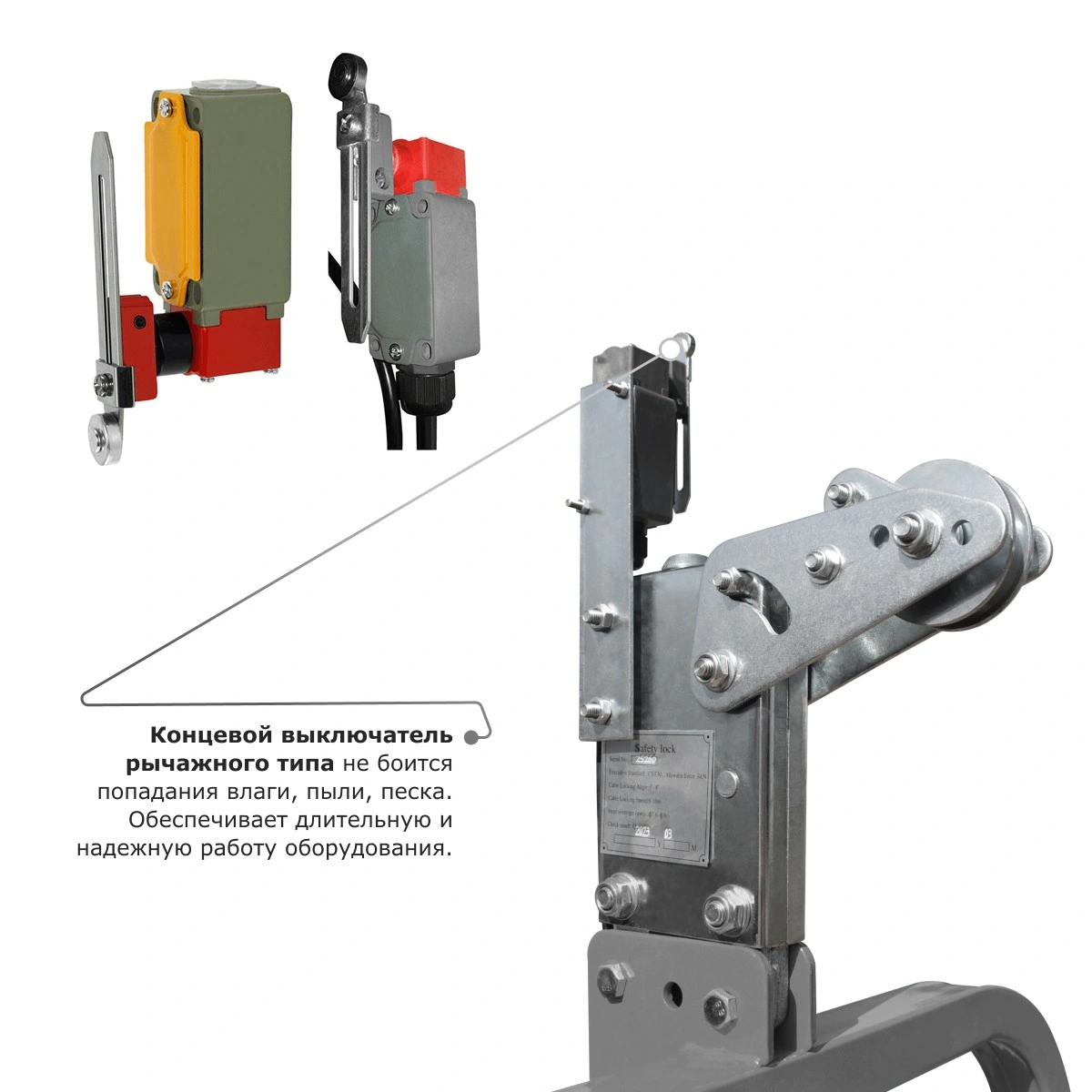 - Концевой выключатель рычажного типа не боится попадания влаги, пыли, песка. Обеспечивает длительную и надежную работу оборудования.