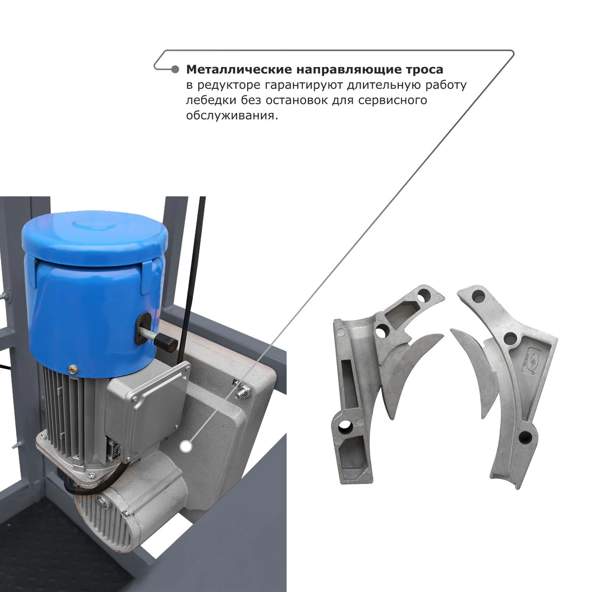 - Металлические направляющие троса в редукторе гарантируют длительную работу лебедки без остановок для сервисного обслуживания.
