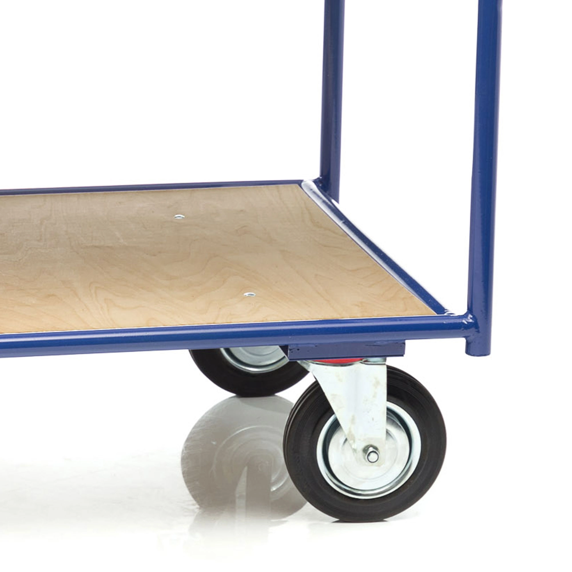 Платформенная двухъярусная 4-х колесная тележка КП-2-200-К используется для перевозки малогабаритных грузов. Платформы имеют металлический каркас накрытый фанерой толщиной 10мм., размер платформы 700х1200мм., расстояние между ярусами 480мм., количество ярусов 2 шт, габаритная высота 1050мм. Покрытие металлических деталей тележки полимерное, цвет - синий. Тележка широко используется на складах, в торговых павильонах, а также в гостиничном и ресторанном бизнесе. Две платформы позволяют удобно расположить перевозимые предметы.Тележка комплектуется двумя поворотными и двумя неповоротными колесами, диаметром 200мм., изготовленными из высококачественной литой резины, комплектом крепежа. Грузоподъемность до 550кг.