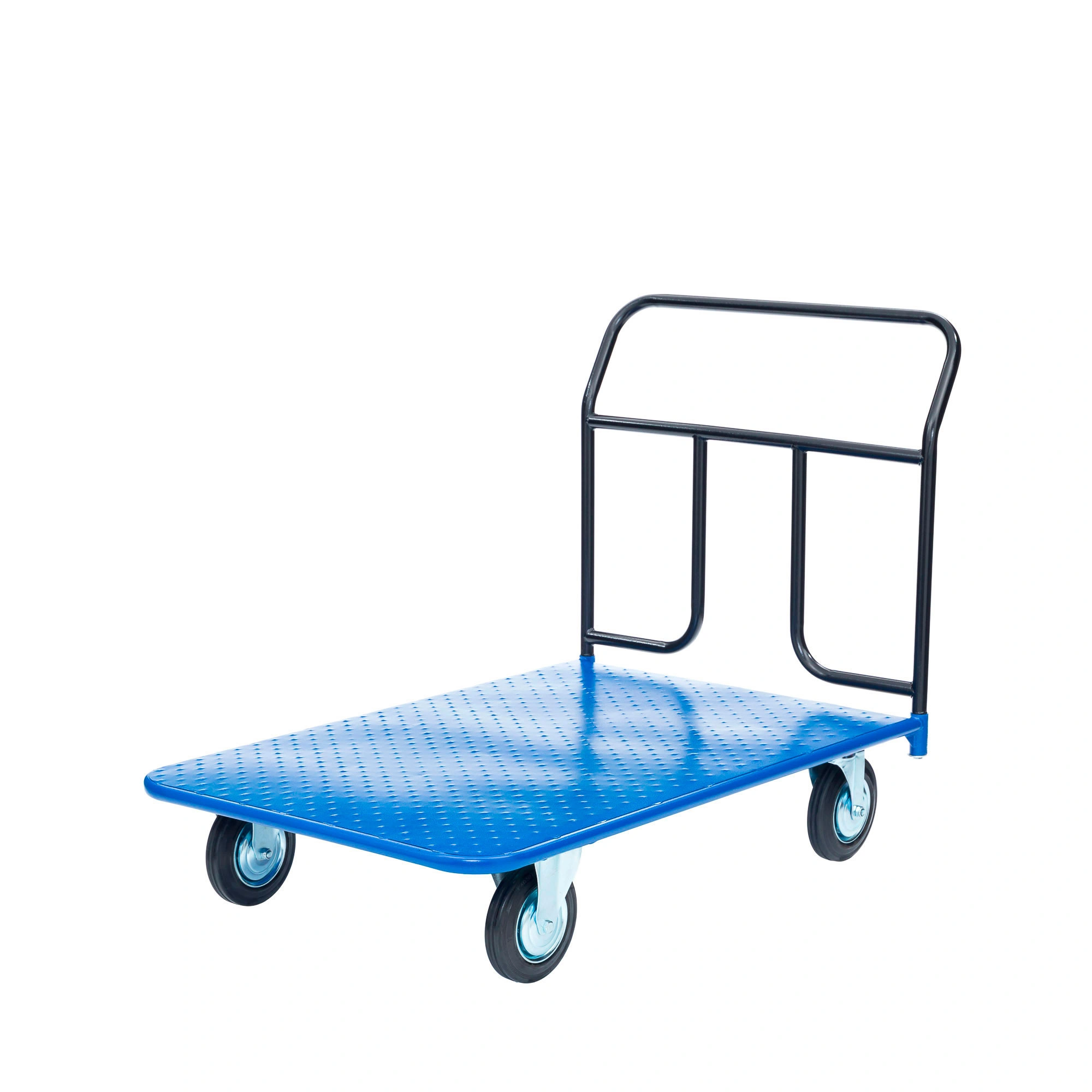 На платформе синего цвета допускается размещать до 300 кг грузов. Тележка приводится в движение за счет толкания прочной и удобной ручки черного цвета с болтовым креплением. Металлические части устройства подвергаются полимерной порошковой обработке, что защищает конструкцию от влаги, пыли, ветра, солнечных лучей и пр.