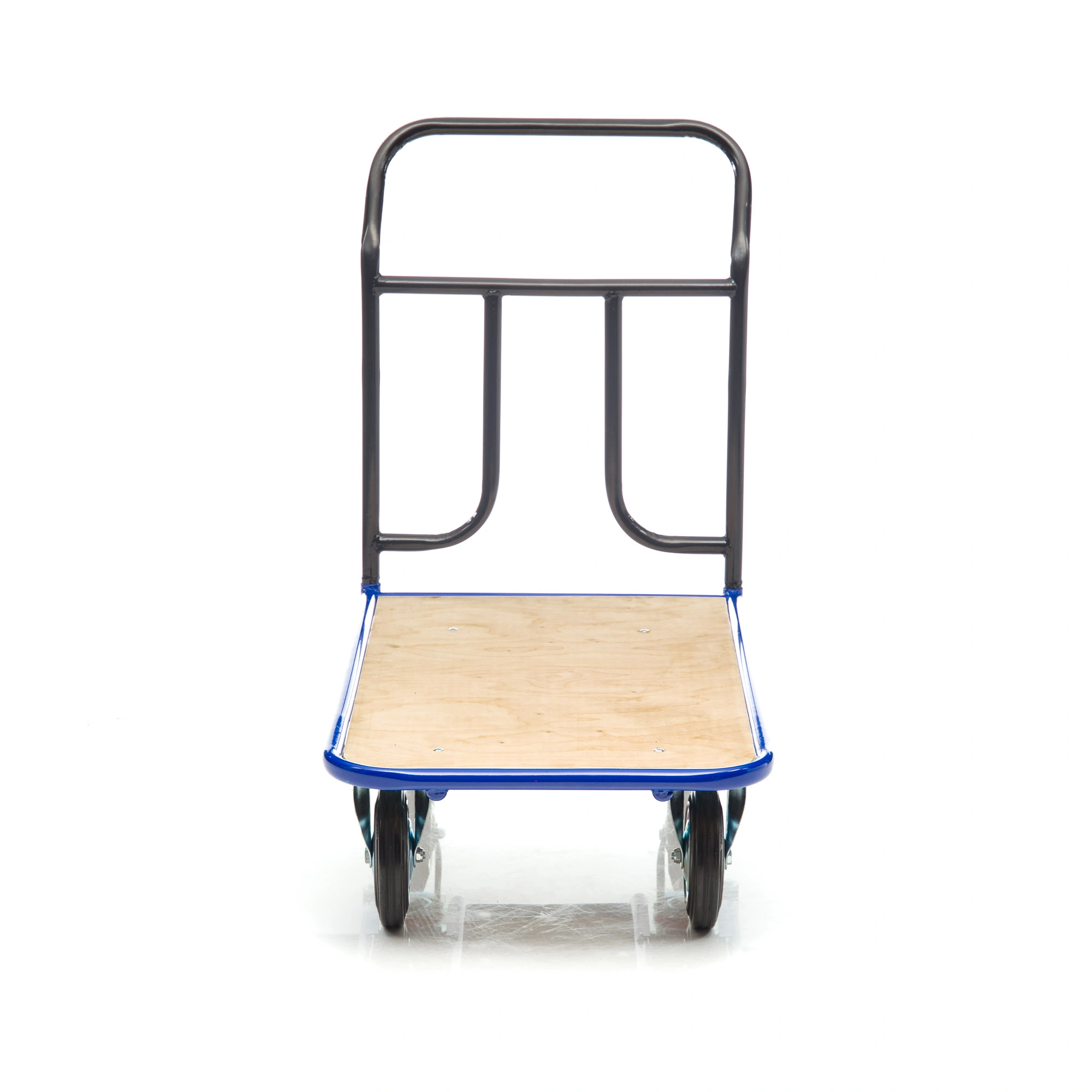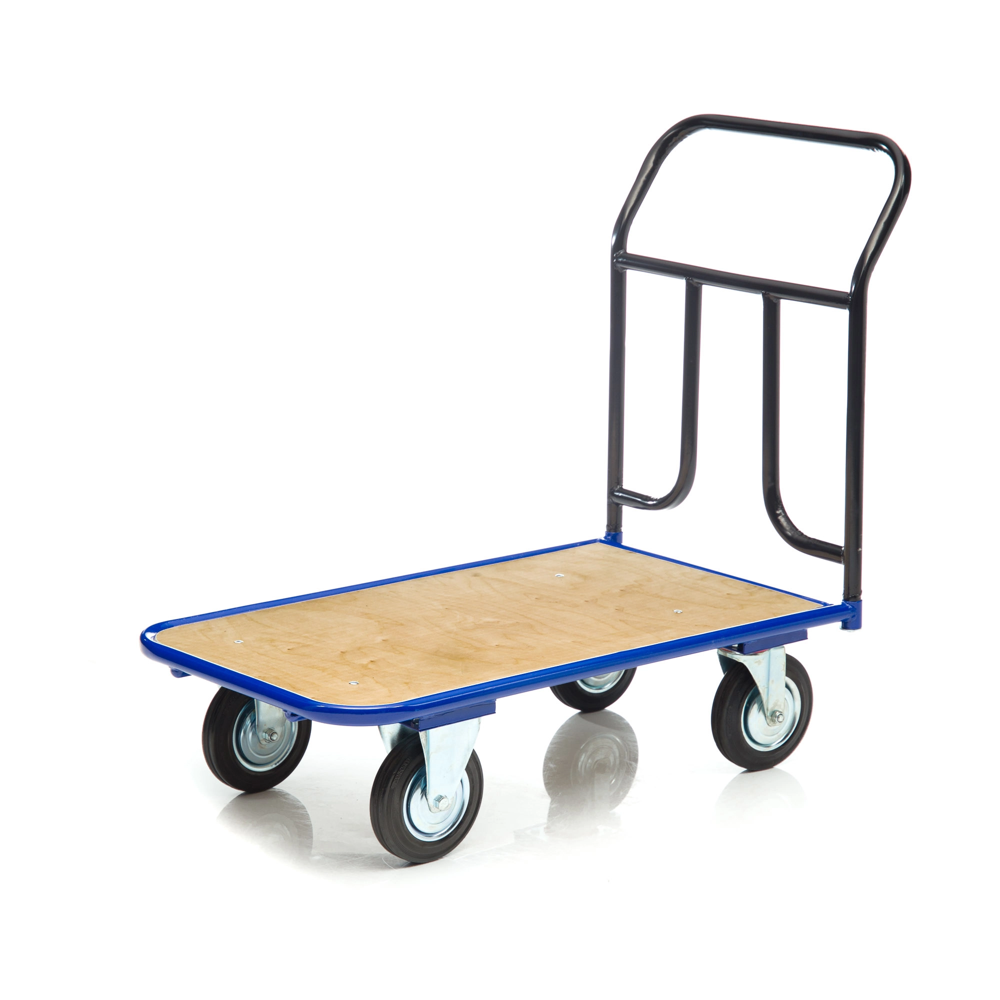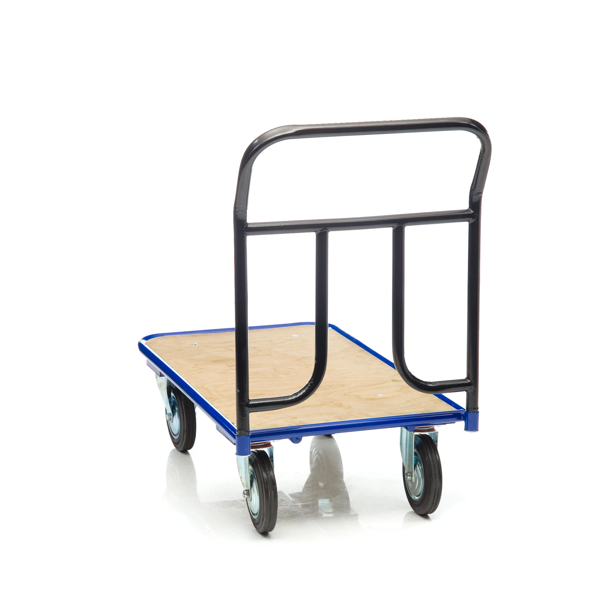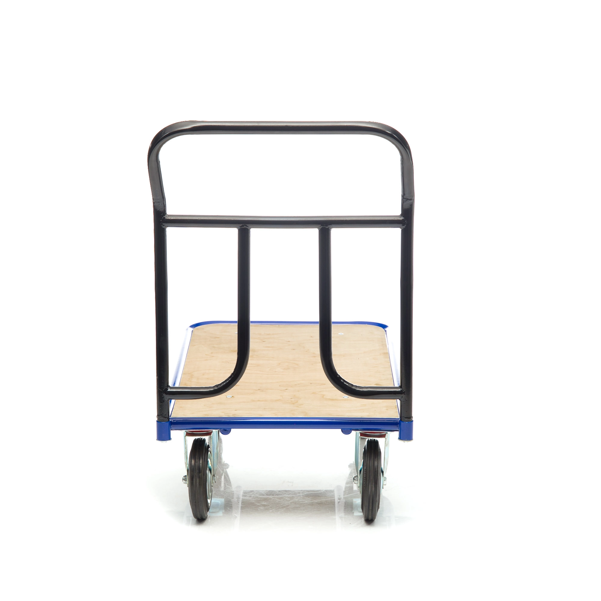 Платформенная 4-х колесная тележка КП-500-150-И (с фанерой) используется для перемещения различных грузов в складских помещениях. Каркас платформы изготовлен из металлической трубы диаметром 28мм., настил из фанеры толщиной 12мм. Размер платформы 600х1000мм. Ручка тележки снимается для компактного хранения. Ручка крепится к платформе болтами. Высота ручки 750мм. Покрытие металлических деталей тележки полимерное. Цвет - синий. Для легкого перемещения тележка комплектуется: двумя поворотными и двумя неповоротными промышленными колесами, диаметром 150мм., из черной стандартной резины, от всемирно известного, ведущего итальянского производителя Tellure Rota, метизами для крепления. Платформа с основанием из фанеры, обеспечивает устойчивое положение груза во время транспортировки. Легкая, малогабаритная тележка применяется на складах, в торговых павильонах, возможно использование и в бытовых целях. Грузоподъемность до 450кг.