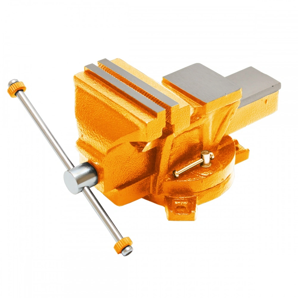 Массивный чугунный корпус и основание покрыты краской, защищающей тиски от коррозии, что увеличивает их рабочий ресурс. Сменные зажимные губки выполнены из закалённой стали высокого качества. Корпус, с возможностью поворота на 360° относительно основания, способствует удобной обработке заготовки. Наличие наковальни расширяет функциональные возможности слесарных тисков. Предусмотрено крепление основания к верстаку (рабочему столу) 3-я болтами.